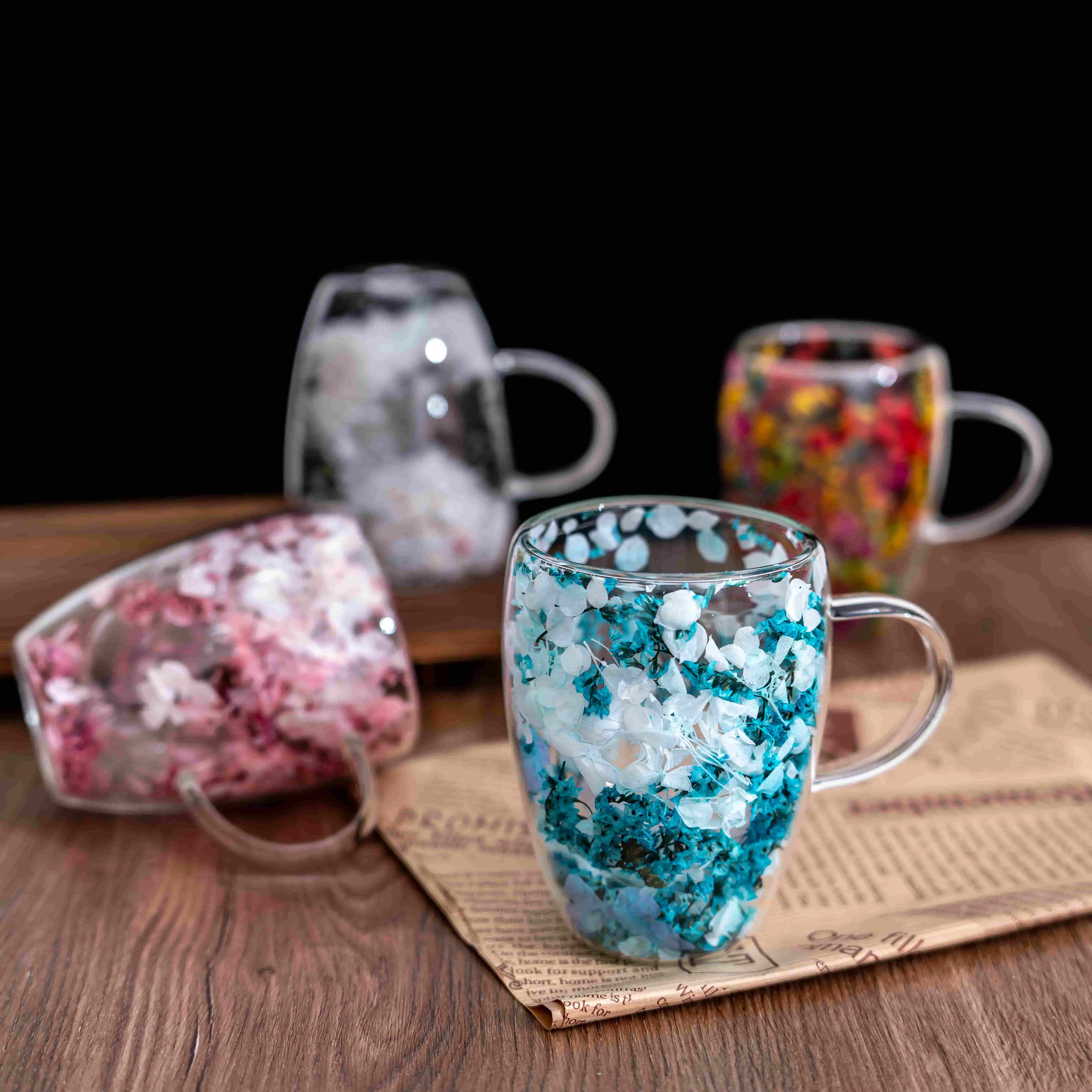 4 pieces of aesthetic dried flower double-layer glass coffee cups, cute tea cups with handles, heat-resistant and durable