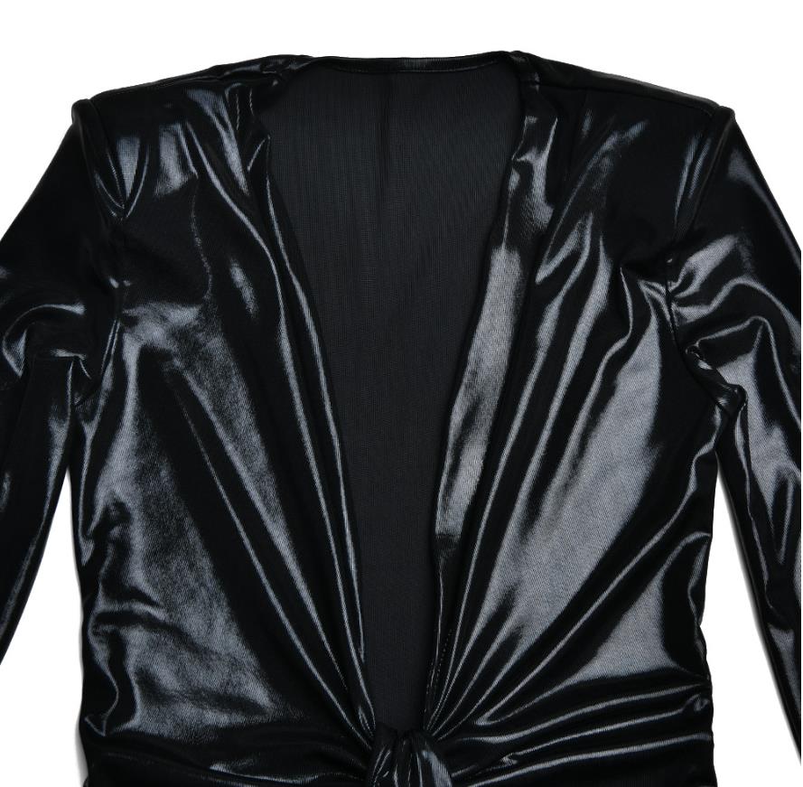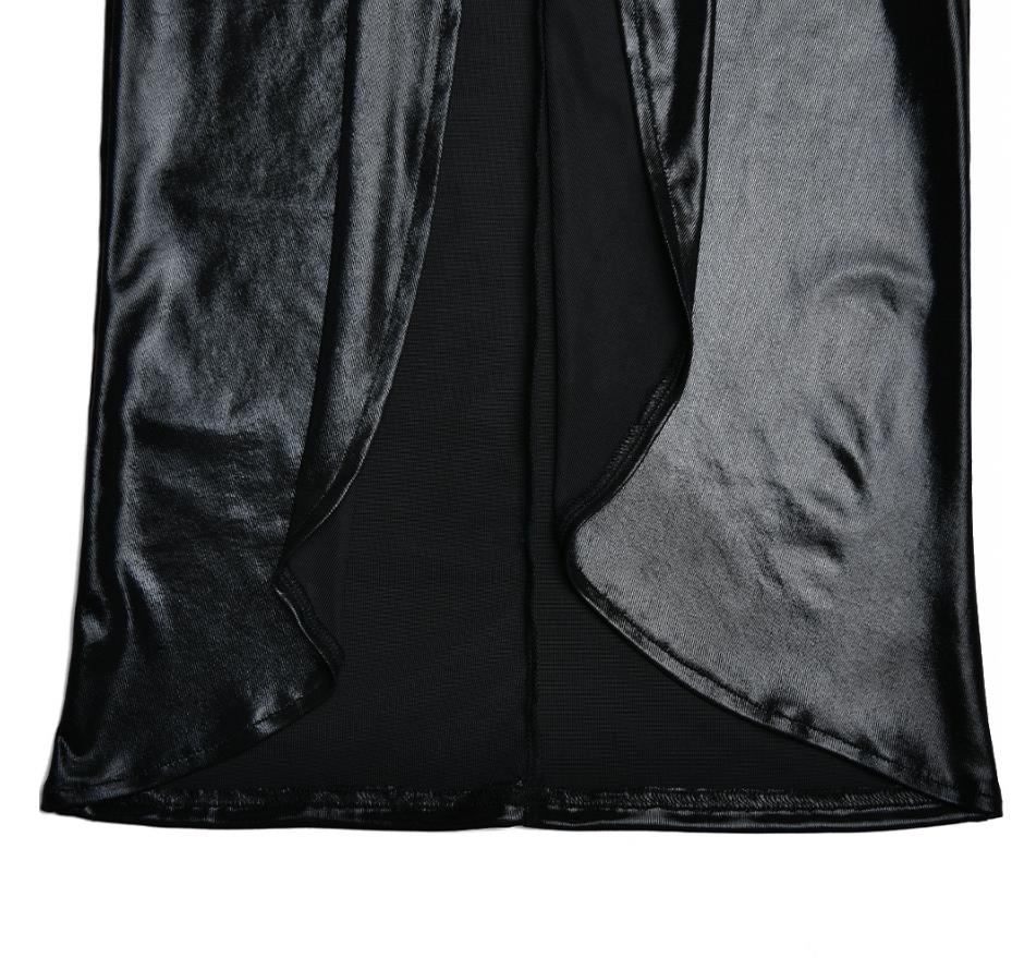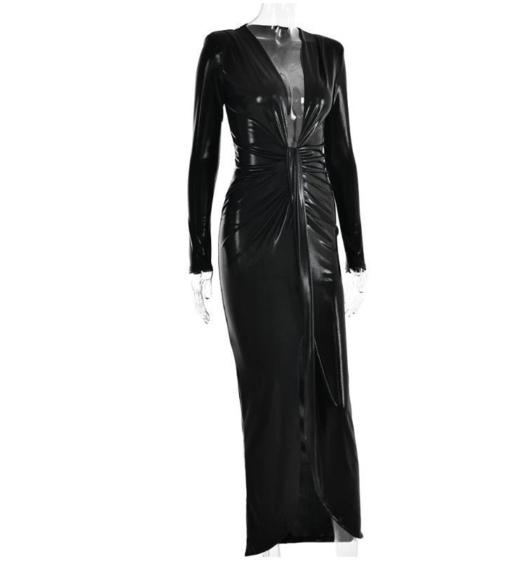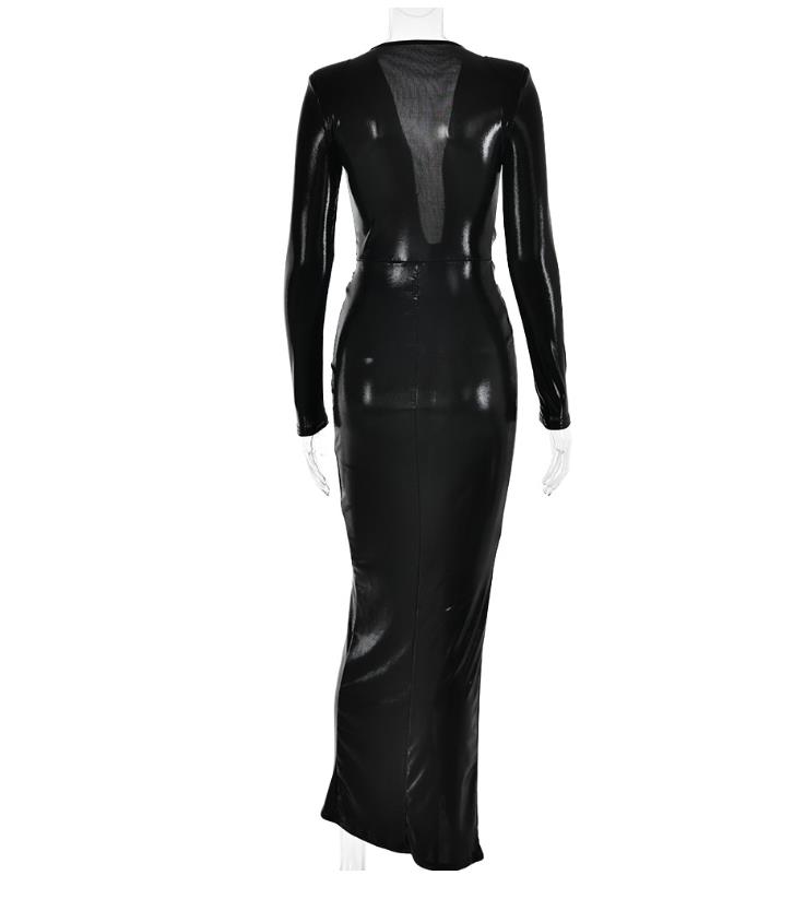 Pu Long Dress Elegant Glossy V Neck Long Sleeves Patchwork Ruffle Hip Leather Skirt Split High Waist Dress
