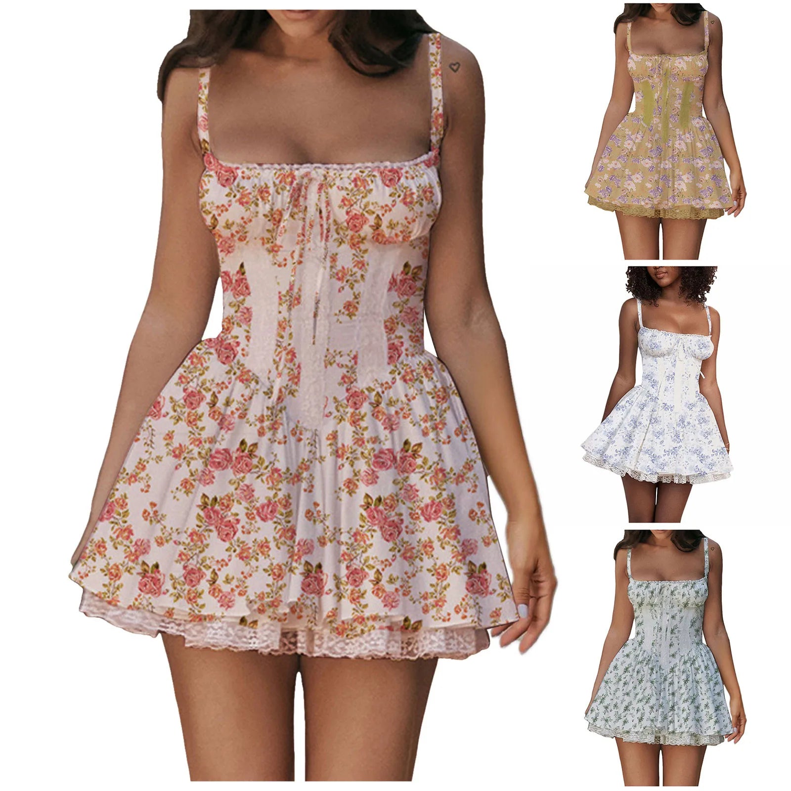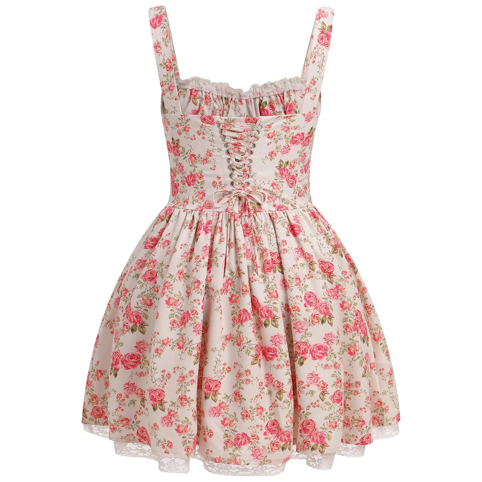 Women Floral Print Mini Dress Sexy Lace Patchwork Suspender Tie Up Corsets Bodycon Short Dresses Summer Boho French Vestidos
