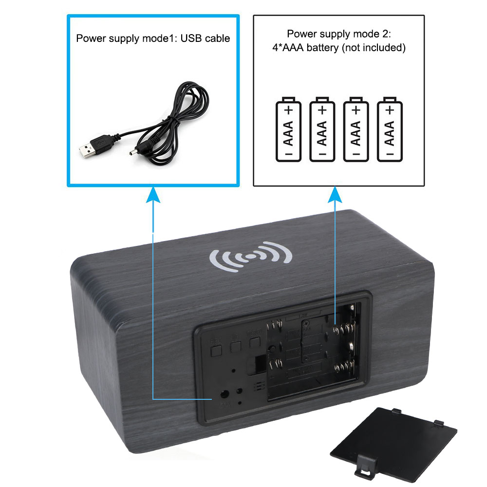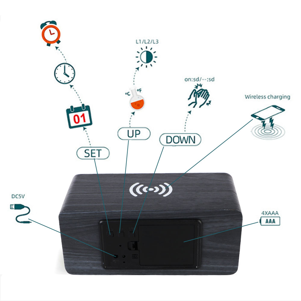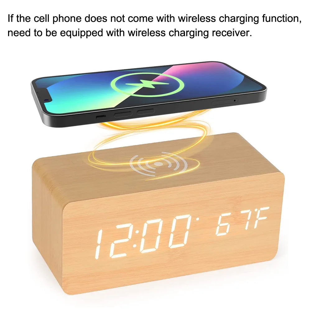 Wooden Desk Digital Clock Phone Chargers LED Display Temperature Wooden Digital Alarm Clock Wireless Charger Desk Table Clocks